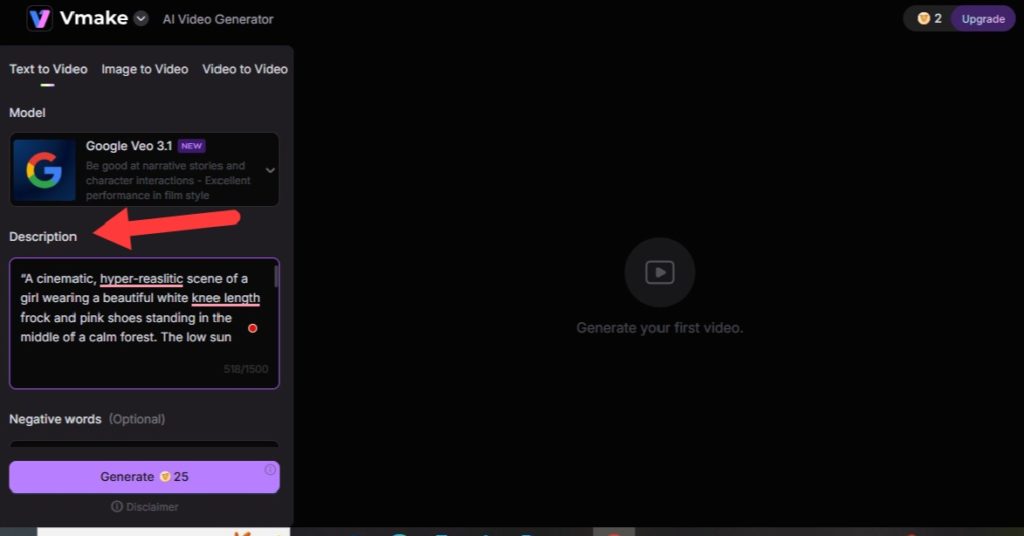- In the description box, write your prompt including the style, characters, and elements you want in your video.