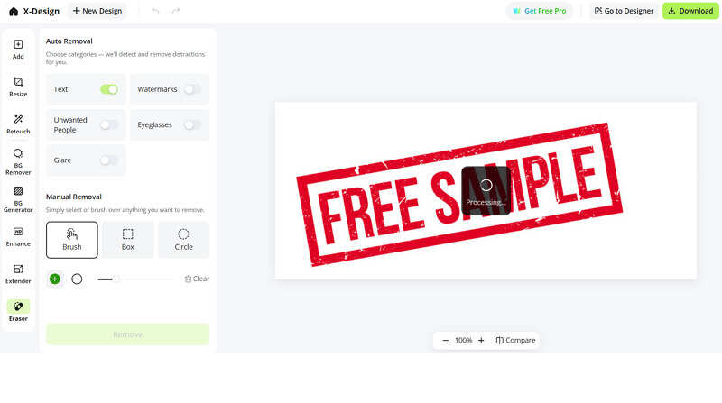 Images are the primary focus of X-Design, as per my hands-on experience. X-Design AI Watermark Remover can detect and remove text, watermarks, trademarks, unwanted people, and even stamps in seconds. It offers both manual and automatic processing, so you can either select the brush to erase the watermark or go for one-click processing.